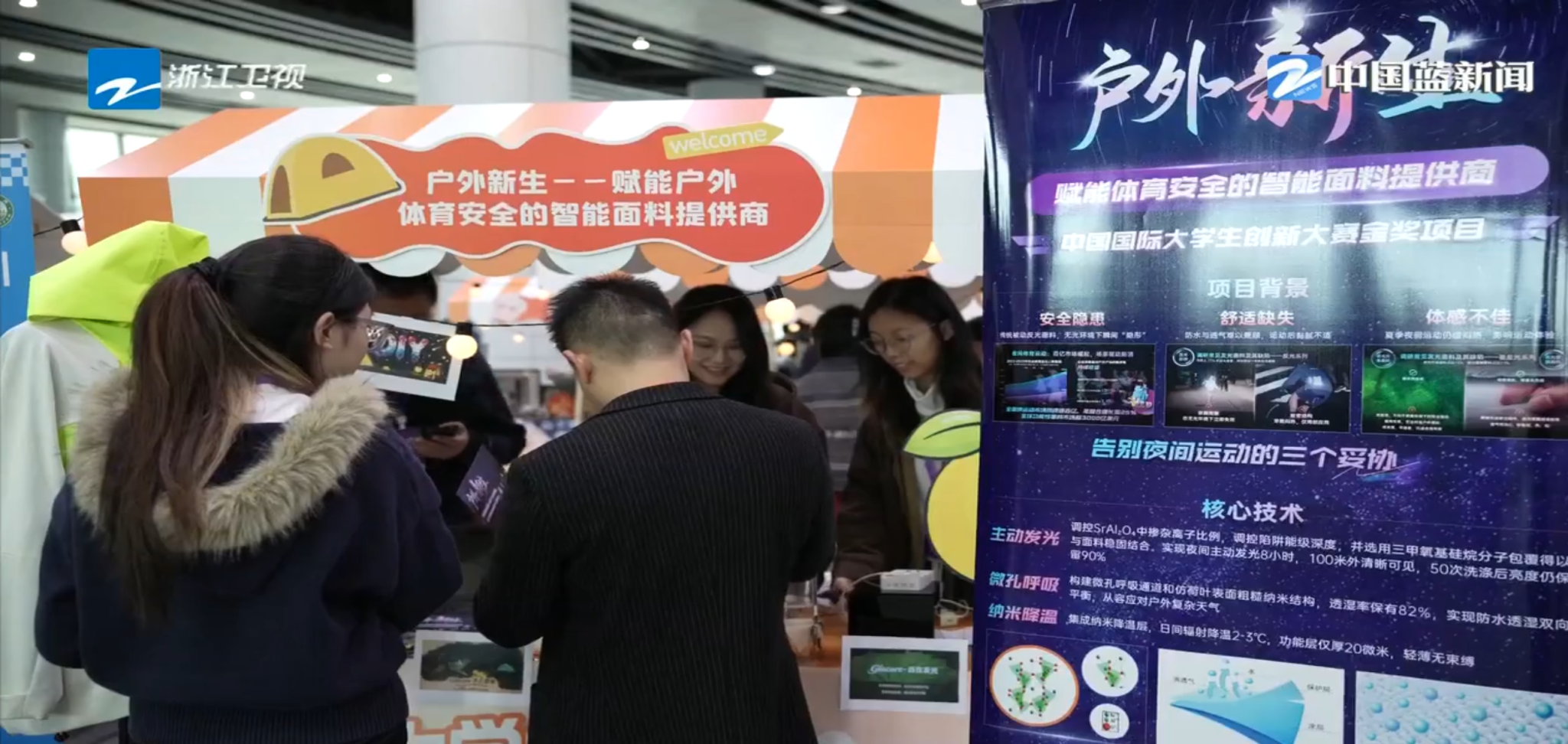 同时,我校另一个参展项目“户外新生——赋能户外体育安全的智能面料提供商”也吸引了众多参会者驻足。项目团队依托绍兴纺织产业资源,历经三年研发攻关,成功开发出集主动发光、高效透气、持久防水与动态降温于一体的创新面料,该面料通过CNAS认证并经科技部查新具备国内外首创性,已被纳入国家纺织面料馆展示,填补了夜间运动装备在安全与舒适性方面的功能空白,在今年的中国国际大学生创新大赛中斩获金奖,实现学校国金零的突破。在创业集市现场,该项目受到了浙江卫视等媒体的关注。